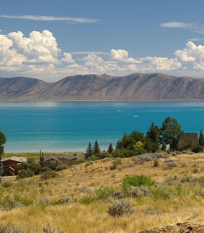 Bear Lake is a beautiful, turquoise, freshwater lake on the border between Idaho and Utah. It is split equally between the two states. The Shoshone Indians lived by the lake and were there when fur trappers (the first white people) saw the lake. Later in 1863, Mormon pioneers settled near the lake.