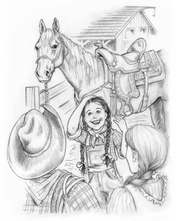 When I turned nine I got a brand-new saddle for Taffy! I had been hoping for one, but I couldn’t see it anywhere! The lumpy packages on the breakfast table were a hoof pick, a bandana, a new set of reins and a bridle. Plus birthday waffles! Then I went outside and there was Taffy! She had a star-studded saddle on her back! I was so excited! Then Chad took me up into the foothills and showed me his old special spot, which he “gave” to me.