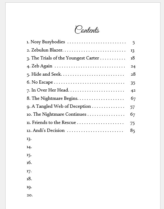 Cover and Contents here. I’m hoping for twenty chapters and I hope I can make it to 175 pages (Trouble at the Line Shack is 154.) The more intense/fun scenes (that must have something to do with the story in some way, of course), the longer this book will be, which I know you like. Oh, one more thing. I gave Philip Barnes (the dead lawyer friend of Justin’s) two little girls, Constance and Sarah, ages 9 and 7. I added them just in case there is something I can do with them and Andi. You just never know. This is called WHAT IF? brainstorming for Plot Events.