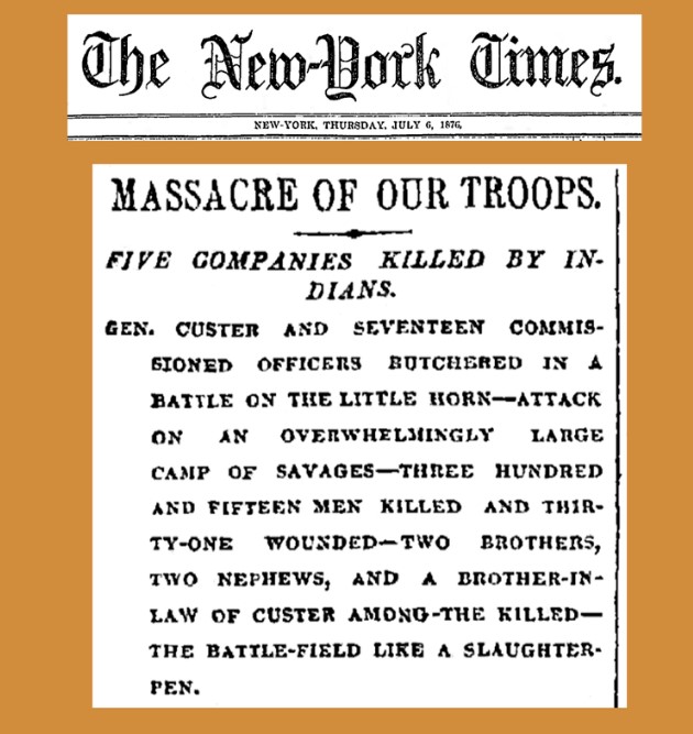 The skin showed a lot of Indians riding horses but even more pictures of dead soldiers. I glanced at it and handed it back. I felt a little sick. Then Randy brought out a wrinkled and much-handled newspaper article from the New York Times. I read about the massacre at the Little Big Horn and felt terrible for all those lost lives.