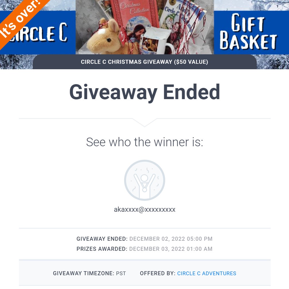 Congratulations to Amy B., the random winner of the Circle C Christmas Gift Basket. I hope you enjoy it. I will send your prize out on Monday. Don’t forget that you still have a couple of days left to enter the Goldtown Christmas Basket >>