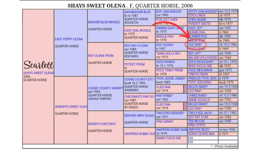 Although Scarlett’s previous owner lost her papers, he did find her registered name. (This is the dam of Kody.) Her registered (quarter horse) name is Shays Sweet Olena. Kristel found her pedigree. Since her DNA is already on record at UCDavis, it will be easy to prove Scarlett is “Shay” and the registered dam of Kody (which ups his value to five digits, like $15,000). Gulp. The amazing news is that her great-great-great grand sire is the famous quarter horse, Doc Bar. If you are interested, you can read about Doc Bar here >>