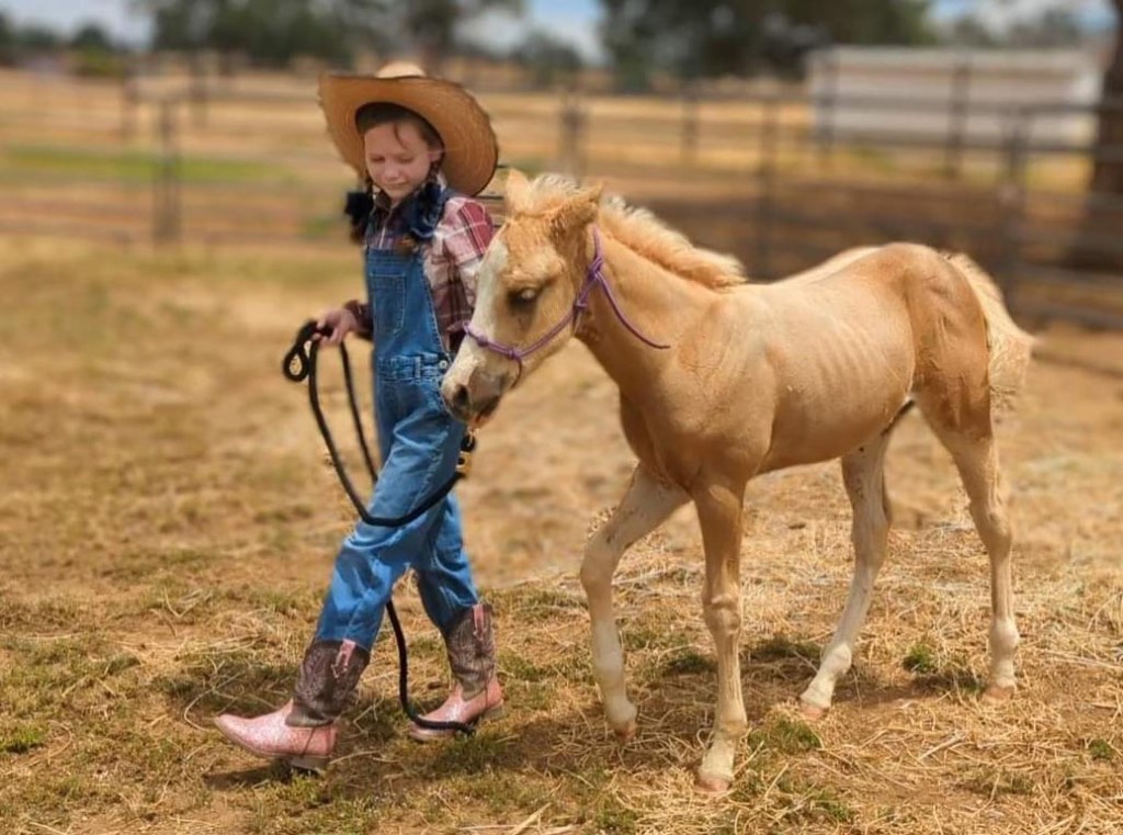 As far as personality, Kody is a perfect gentleman still. He is huge (probably will top out at 17hh as an adult!), but even Kristi (a petite age 10) can handle him without any worries. She picks his feet and leads him around. Look at that tail! It’ going to go to ground like his sire, for sure! Kristel almost didn’t want me to use these pictures. Kody was so pretty as a two-week-old cremello foal, but his random shedding of his baby coat makes him look scruffy. But I think he’s beautiful and I miss him so much!
