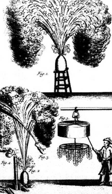 While the “boom” was great, the colors were not. As in . . . these early fireworks had no color or only orange. What did the Chinese use these exploding tubes for? The paper ones were used to scare off evil spirits and to celebrate weddings or a new baby. They stuffed them full and tossed them into the fire. Bang! That’s it. A fireworks show back then was just a bunch of noisy explosions. However, it didn’t take long (maybe a couple hundred years), to go beyond just a noisy bang in the fire. They shot the fireworks UP and turned them into exciting “aerial” displays.