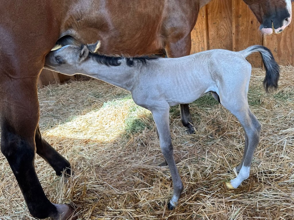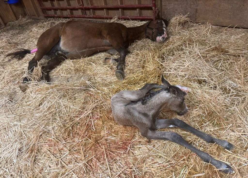 Last night about 11 pm, June 24, 2025, Maggie delivered a stunning little colt. The mare is only about 14hh, so it was touch and go there for a while. Kristel had to assist to help him be born before poor Maggie (in her 20’s) gave up. The shoulders were stuck and Kristel thought the colt had died since he wasn’t moving! (Shades of Andi and Chad and Taffy!) But she kept at it, and the little fellow came through healthy and active after the trauma. She is just thankful that he was lined up perfectly (hooves and nose) or she would have had a dead mama and baby.