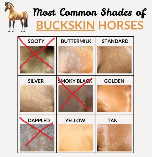 Here are the most common buckskin shades. It’s impossible for Rubicon to throw “smokey black” or “sooty.” And for sure, Baby is not “dappled.” So, that leaves six choices. Which one would be your guess?