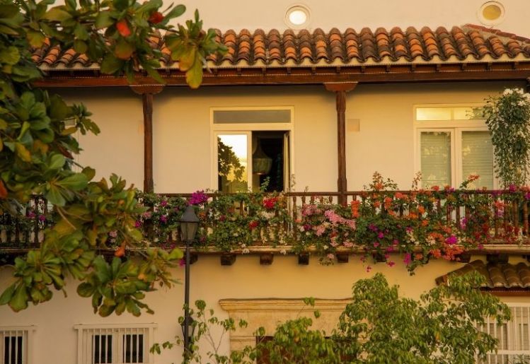 The ranch house is situated on the valley floor and is styled after the practical and lovely Spanish haciendas of an earlier era. Thick stucco (adobe) walls keep the summer heat out (in the days before air conditioners). The house is two stories, The bedrooms have French doors leading onto the balcony.