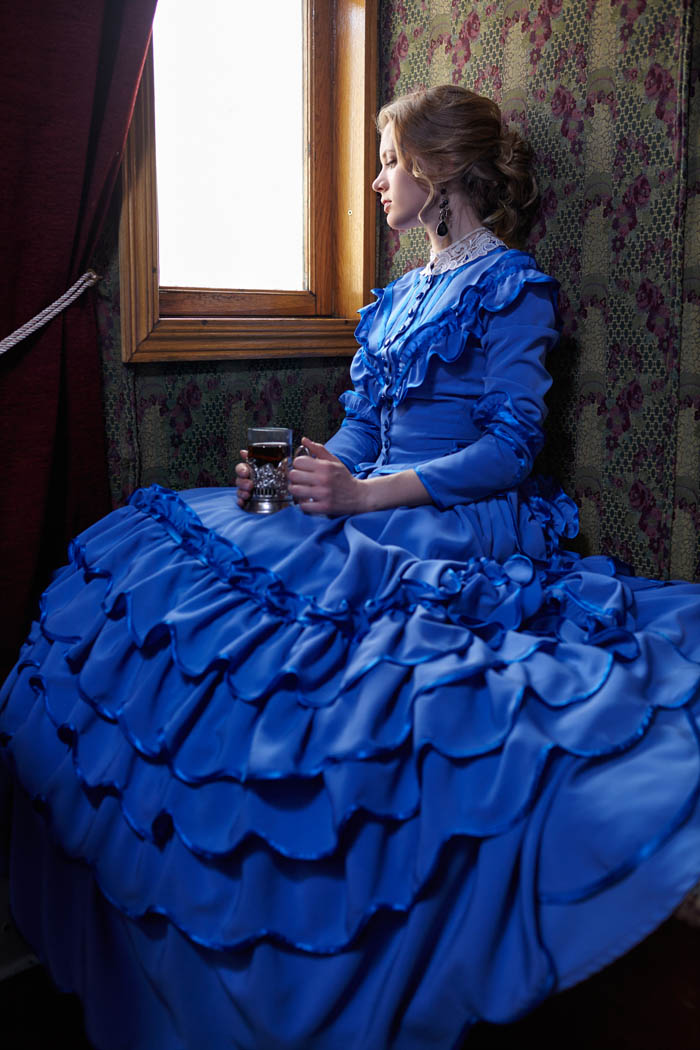 Young woman in blue vintage dress late 19th century sitting in coupe of retro railway train, looking out the window and drinking tea